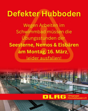 Am Montag, den 16. März, finden im Schwimmbad Reparaturarbeiten am Hubboden statt. Aus diesem Grund müssen die Übungsstunden der Seesterne, Nemos und Eisbären sowie der Altersklassen 9/10, 11/12 und 13/14 leider entfallen. Betroffen sind die Trainingszeiten von 17 bis 18:50 Uhr. Alle weiteren Übungsstunden am Montag können nach aktuellem Stand wie gewohnt stattfinden.